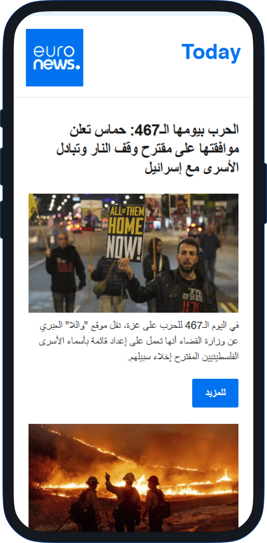 .تقدم لك النشرة الإخبارية اليومية من غرفة أخبار يورونيوز وتصل مباشرة إلى بريدك الإلكتروني، ملخصات سريعة وموثوقة وتحليلات ثاقبة ومقالات متعمقة